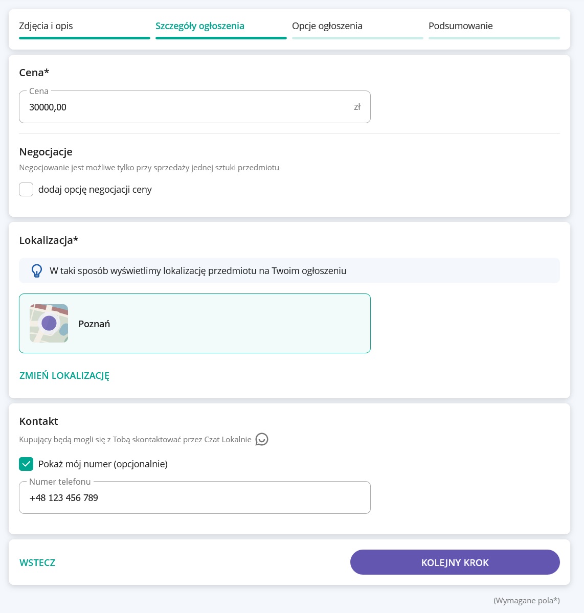 Podaj cenę pojazdu i lokalizację, pamiętaj też o swoich danych kontaktowych