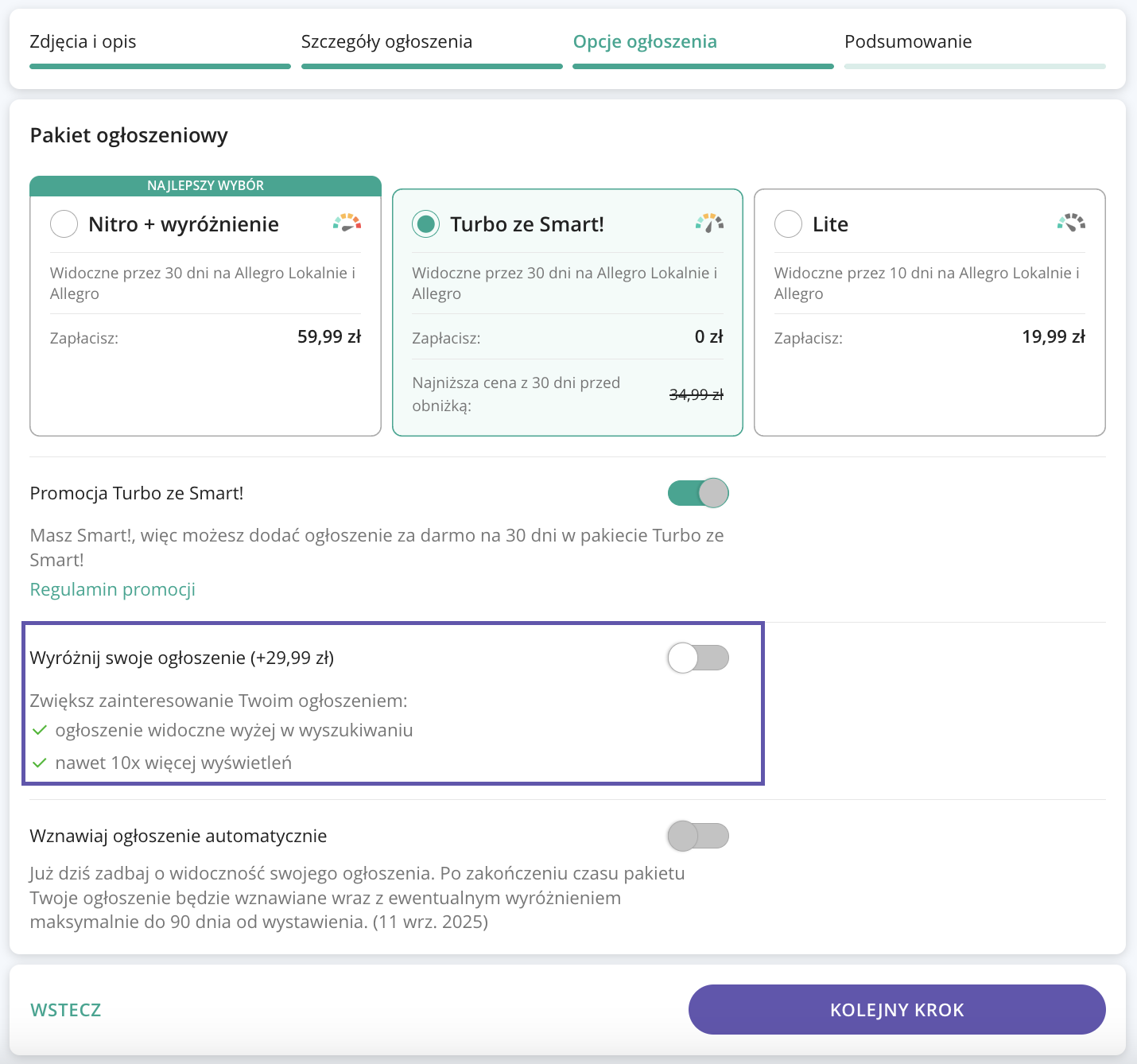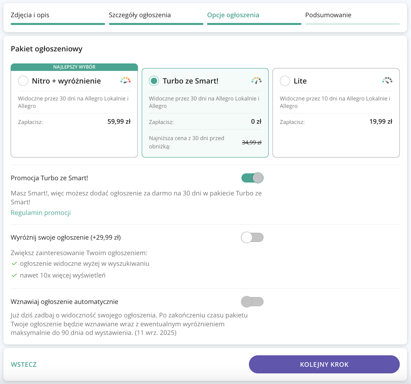 - wystawić ogłoszenie pojazdu za darmo na 30 dni na Allegro Lokalnie wybierając pakiet Turbo ze Smart! w jednej z kategorii objętych promocją