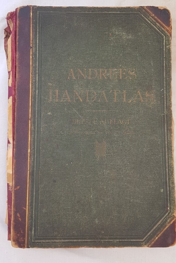 ANDRESS ALLGEMEINER HANDATLAS, to podręczny atlas Świata zawierający 99 map głównych i 82 mapy dodatkowe wraz z indeksem nazw, zamieszczonym na końcu atlasu. Wydanie trzecie całkowicie poprawione i powiększone. Wydanie Instytutu Geograficznego Velhagen&Klasing w Lipsku. Bielefeld&Leipzig 1896. Skład uszkodzony, okładki tekturowe są oddzielone i kilka pierwszych stron. Zasadnicza część składu jest w całości solidnie zszyta i sklejona. Indeks nazw na końcu atlasu jest zupełnie rozsypany i niektóre strony są w kawałkach. W składzie brakuje jednej kartki ze stronami 23 i 24 z mapą wschodniej części Polski. Pozostałe strony atlasu z mapami wg numerów są kompletne i niczego nie brakuje. Format 45x30 cm, grubość całego składu to ok. 5 cm, grubość tekturowej okładki około 5 mm. Waga atlasu to ok. 3 kg. Wysyłka bezpieczna.