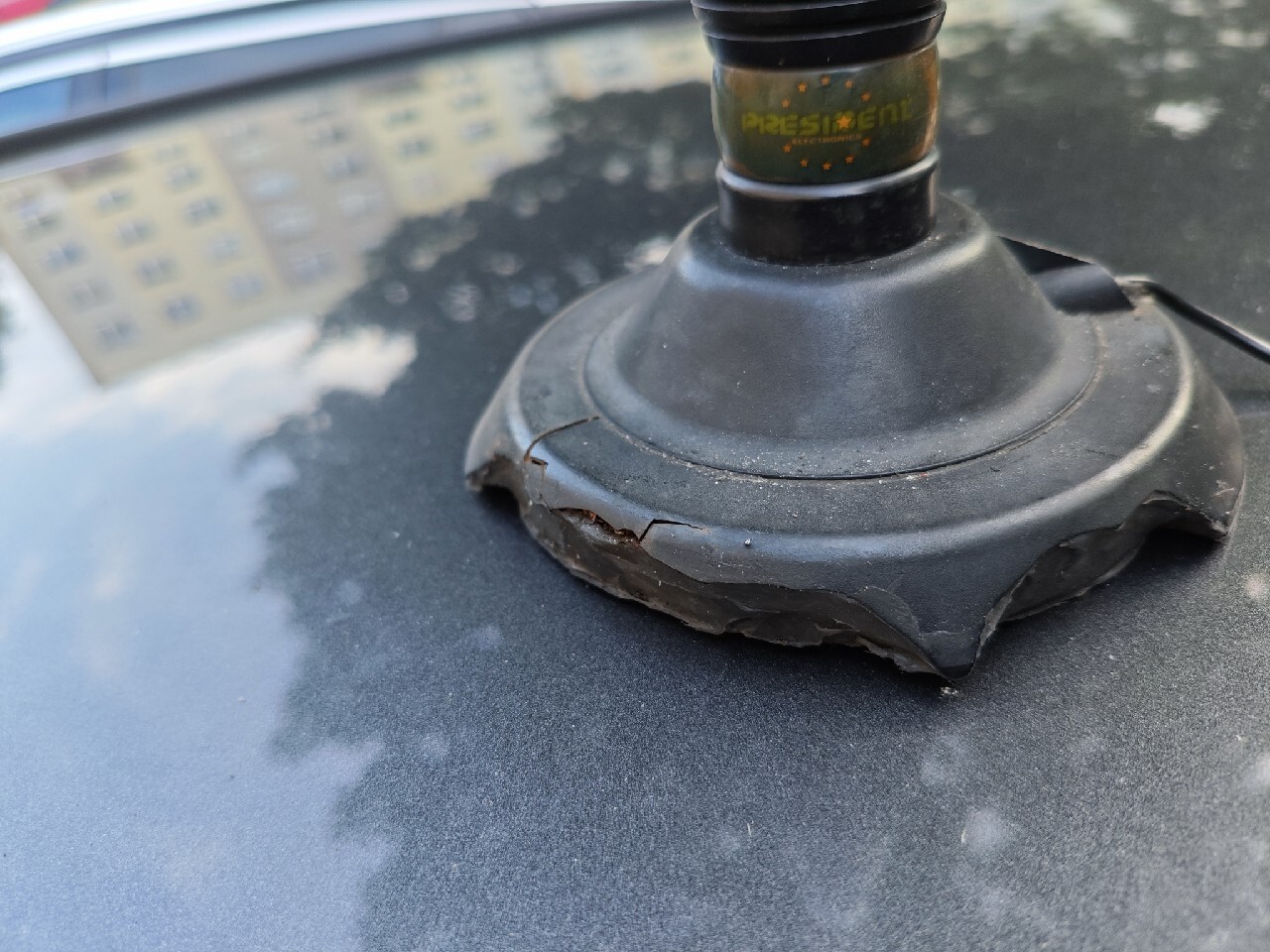Na sprzedaż Antena CB President ML 145 jak widać pęknięta podstawa, co nie wpływa nadawanie i odbiór. Wymieniony oryginalny kabel na dłuższy cienki, dzięki czemu nie ma już problemu z przecinaniem kabla przez klapę bagażnika. Długości kabla nie pamiętam ale spokojnie starcza aby go puścić od deski rozdzielczej tunelem środkowym za fotelem pasażera przy progu do bagażnika po tylnym słupku w bagażniku aż na sam róg dachu i jeszcze zostaje (Auto kombi).