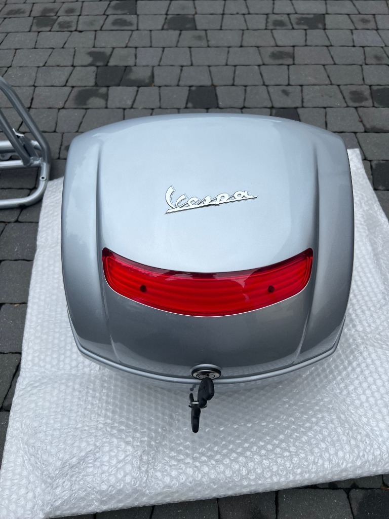 Oryginalny kuferek VESPA – srebrny z kluczykiem i światłem odblaskowym