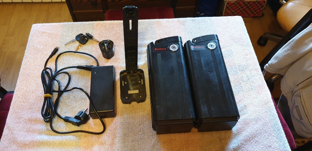 Do sprzedania: 2 baterie akumulatorowe Li-Jon 36/10A do rowerów z silnikami 250 W wraz z prowadnicą, gniazdem, kompletem kluczyków, ładowarka, złącze ładowania 1-pinowe.