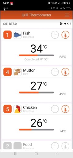 Aplikacja termometru do grilla. Termometr do grilla działa w zależności od rodzaju mięsa między dobrze wypieczonym, średnim, średnio surowym i surowym, zaprogramowane wartości temperatur można zmieniać zgodnie z osobistymi preferencjami. Zaprogramowany zakres temperatur dla wszystkich rodzajów mięsa, takich jak wołowina, jagnięcina, kaczka, wieprzowina. Alarm i minutnik dla przyjemnego gotowania. Ten termometr sprawi, że będziesz szefem kuchni.
