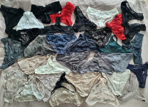 33 pary majtek, 9 par biustonoszy oraz 5 par rajstop. Wszystko w różnych kolorach, fasonach i rozmiarach. Stan dobry.