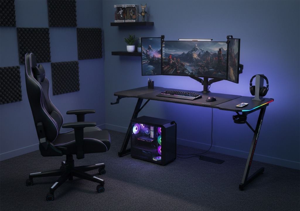 Biurko posiada efektowne oświetlenie ARGB sterowane pilotem. Ma różne tryby dające wiele możliwości dostosowania kolorów - jasności oraz prędkości zmieniania się. Można ustawić jeden kolor na stałe lub ich automatyczne zmienianie z wybraną prędkością. Oświetlenie można także łatwo wyłączyć.