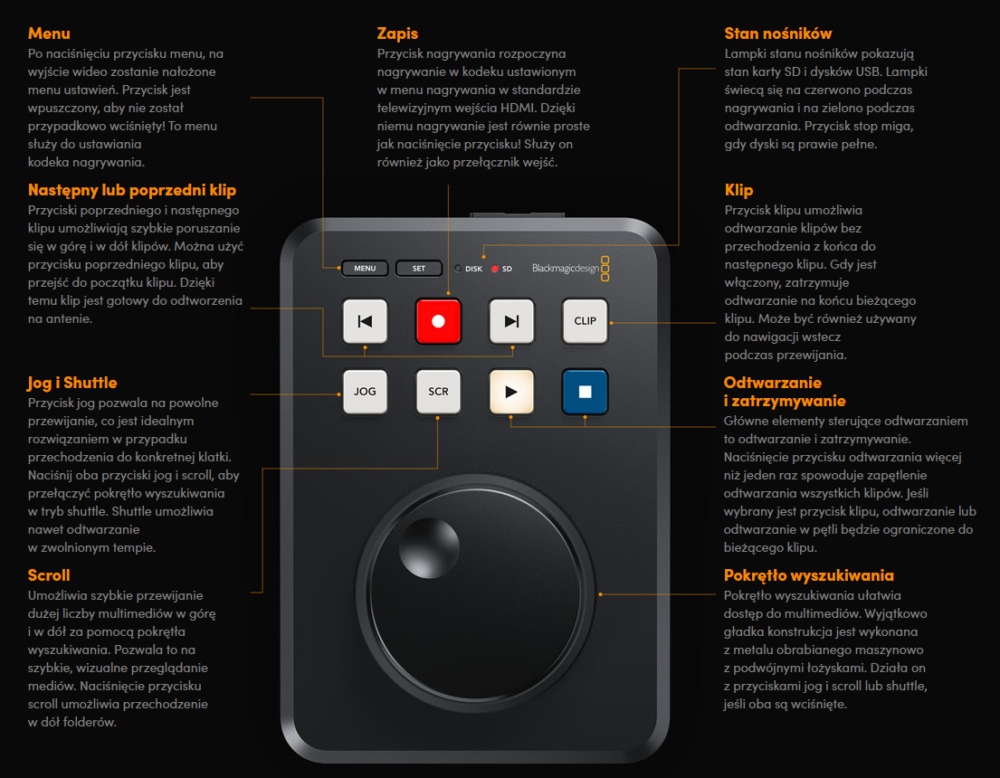 Wejścia wideo HDMI1Wyjście wideo HDMI1Wejścia Audio HDMI8-kanałowe wbudowane audioWyjścia Audio HDMI8-kanałowe wbudowane audioKonfiguracja nagrywarkiPrzez interfejs użytkownika na wyjściu HDMI lub Blackmagic HyperDeck Ethernet ProtocolEthernet1Gb/sInterfejs komputera1 x USB typu C 3.0 (do 5 Gb/s) do nagrywania na dysk zewnętrzny, oprogramowania sterującego, konfiguracji oprogramowania i aktualizacjiStandardy wideo SDI525i59.94 NTSC, 625i50 PALStandardy wideo HD720p50, 720p59,94, 720p60, 1080i50, 1080i59,94, 1080i60, 1080p23,98, 1080p24, 1080p25, 1080p29,97, 1080p30, 1080p50, 1080p59,94, 1080p602K DCI Standardy wideo2Kp23,98 DCI, 2Kp24 DCI, 2Kp25 DCI, 2Kp29,97 DCI, 2Kp30 DCIPróbkowanie AudioTelewizyjny standard 24 bitów, częstotliwość próbkowania 48 kHzPróbkowanie wideo4:2:2 YUVPrecyzja kolorów10-bitowaPrzestrzeń kolorówREC 601, REC 709Obsługuje wiele prędkości transmisjiAutomatyczne wykrywanie SD i HDProRes HQ QuickTimeWszystkie formaty do 1080p60ProRes 422 QuickTimeWszystkie formaty do 1080p60ProRes LT QuickTimeWszystkie formaty do 1080p60ProRes Proxy QuickTimeWszystkie formaty do 1080p60DNxHD 220xHD 720p i 1080p z prędkością do 60 kl/sDNxHD 220x MXFHD 720p i 1080p z prędkością do 60 kl/sDNxHD 145HD 720p i 1080p z prędkością do 60 kl/sDNxHD 145 MXFHD 720p i 1080p z prędkością do 60 kl/sDNxHD 45HD 720p i 1080p z prędkością do 60 kl/sDNxHD 45 MXFHD 720p i 1080p z prędkością do 60 kl/sH.264 Wysokie 4:2:0 8‑bitoweWszystkie formaty do 1080pH.264 Średnie 4:2:0 8‑bitoweWszystkie formaty do 1080pH.264 Niskie 4:2:0 8‑bitoweWszystkie formaty do 1080pSterowanie wbudowane10 przycisków do sterowania transportem i urządzeniem oraz metalowe pokrętło wyszukiwaniaSterowanie zewnętrzneRozpoczęcie/zatrzymanie HDMI, uruchomienie kodu czasowego. Zawiera Blackmagic HyperDeck Ethernet Protocol. Obsługuje zdalne przesyłanie plików przez FTPTeleprompter - prędkości transmisjiWyjście 23,98p, 24p, 25p, 29,97p, 30p, 50p, 59,94p, 60p z domyślnie ustawioną najwyższą szybkościąTeleprompter - obsługiwane formaty plikówBogaty format tekstu (.rtf) z obsługą większości formatowania RTF. Zwykły tekst (.txt)