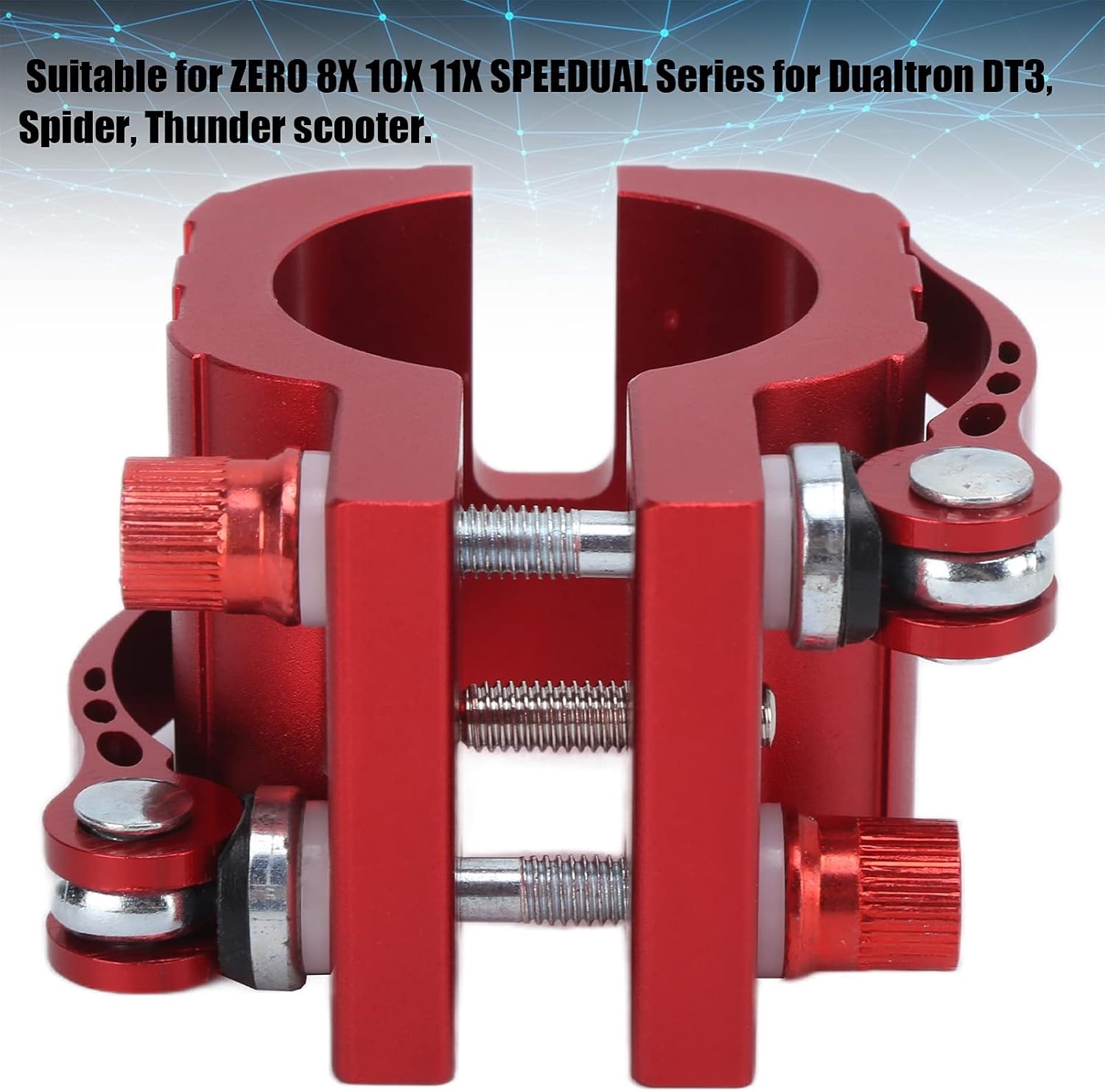 Solidna blokada / zacisk kolumny kierownicy do hulajnóg elektrycznych, zaprojektowana w celu zwiększenia stabilności oraz eliminacji luzów i skrzypienia podczas jazdy.