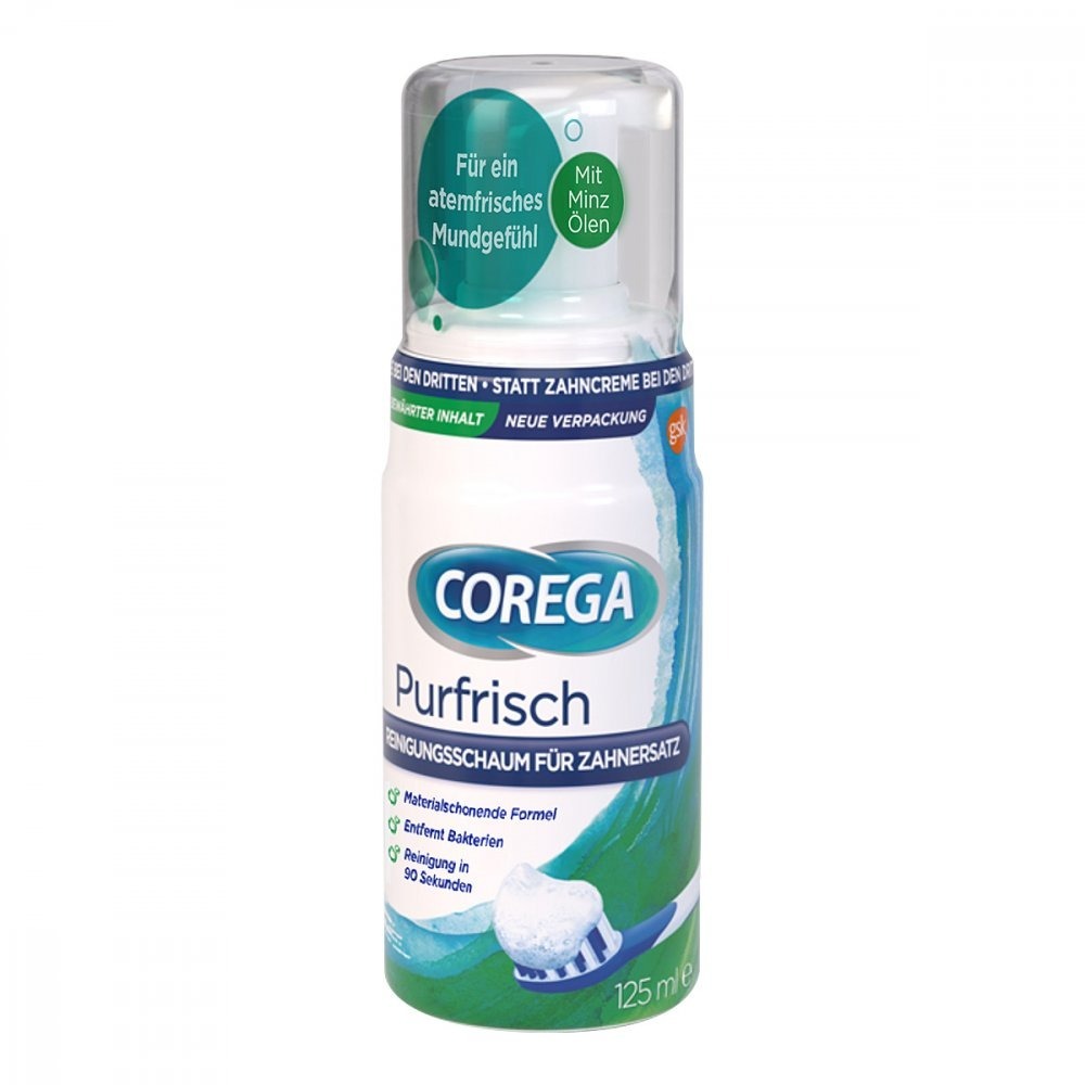 Corega Purfrisch pianka (Opakowanie: 125 ml) to antybakteryjna pianka, która łatwo się rozprowadza po całej powierzchni protezy i wnika w przestrzenie międzyzębowe. W połączeniu z czyszczeniem mechanicznym szczoteczką, usuwane są wszelkie osady i resztki pokarmowe. Kosmetyk eliminuje nawet 99,9% bakterii, które mogą być odpowiedzialne za: powstawanie nieświeżego oddechu, stany zapalne dziąseł lub próchnicę pozostałych zębów własnych.
