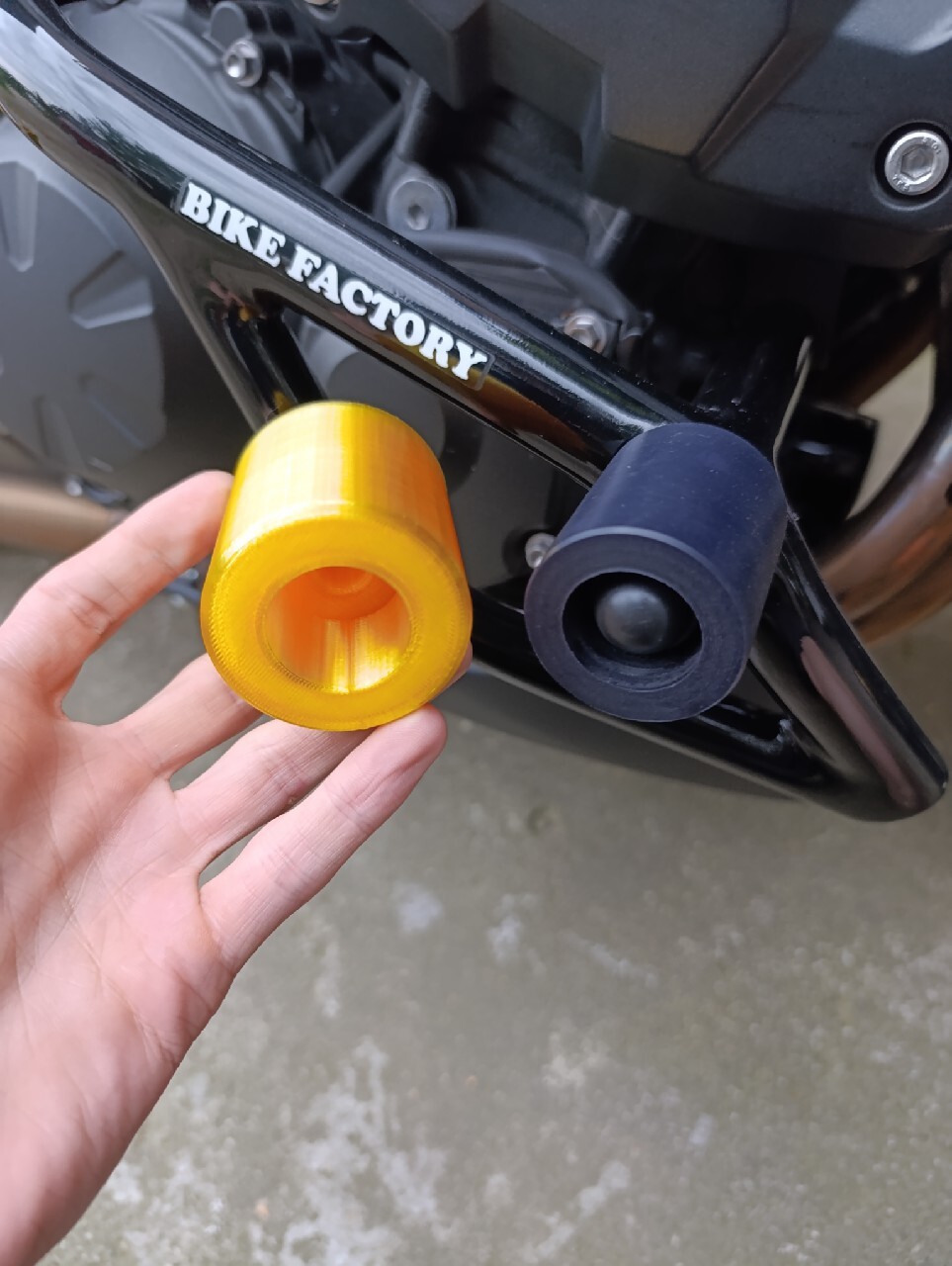 Witam, wykonuje projekt lub gotową który jest podany na zdjęciu (do Kawasaki z750 2010 może być inny rocznika jak mają taki sam gmole) Materiał PETG (100% wypełnienie która daje możliwość wytrzymałość ścieranie, testy na ostatnim zdjęciu) średnica otworu 10mm