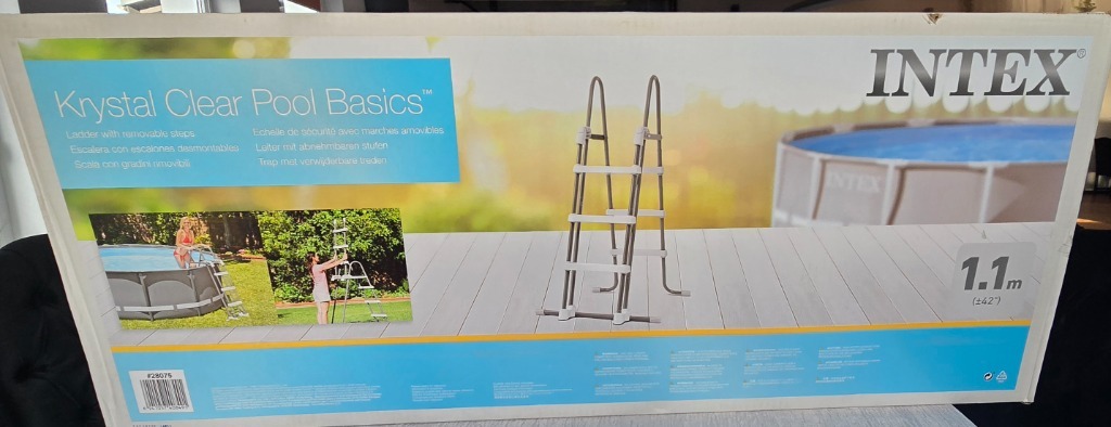 Drabina do basenu Intex 28075 o regulowanej wysokości od 91 do 107 cm. Solidna konstrukcja metalowa zapewnia stabilność i bezpieczeństwo podczas wchodzenia do basenu.