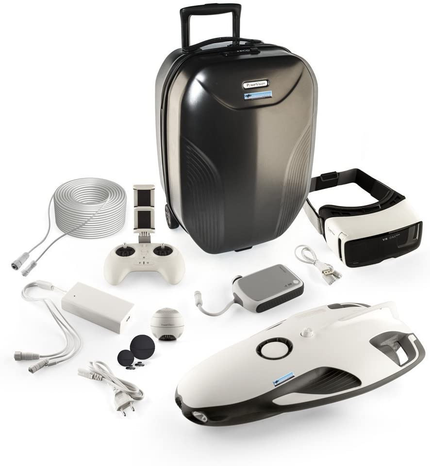 W zestawie twarda walizka; w zestawie okulary Zeiss VR One Plus, PowerRay wraz z wbudowanym akumulatorem, kontrolerem, stacją bazową, kablem 70 m, pamięcią 32 GB, ładowarką; moduł sonar (PowerSeeker)