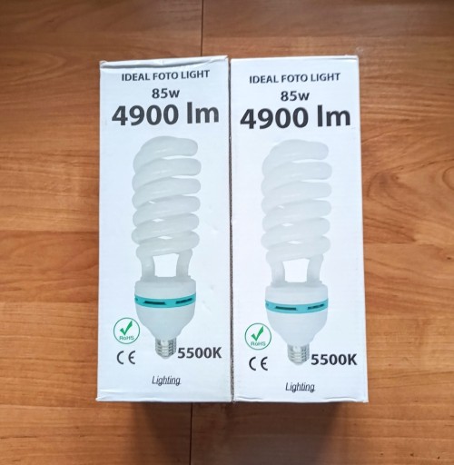 Dwie żarówki studyjne Ideal Foto Light o mocy 85W i strumieniu świetlnym 4900 lm. Żarówki mają temperaturę barwową 5500K, co zapewnia neutralne, naturalne oświetlenie. Gwint E27