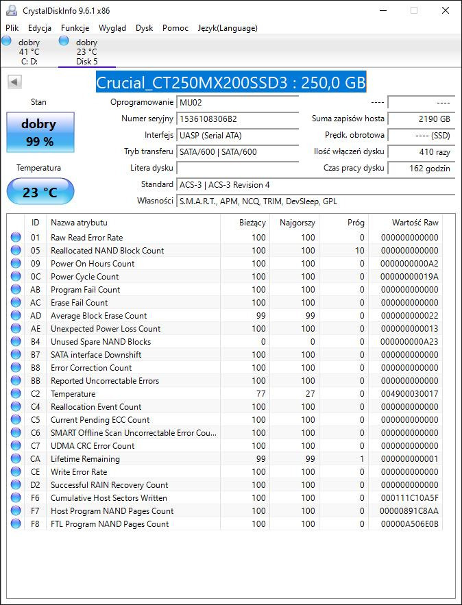 | Pojemność dysku | 250GB |