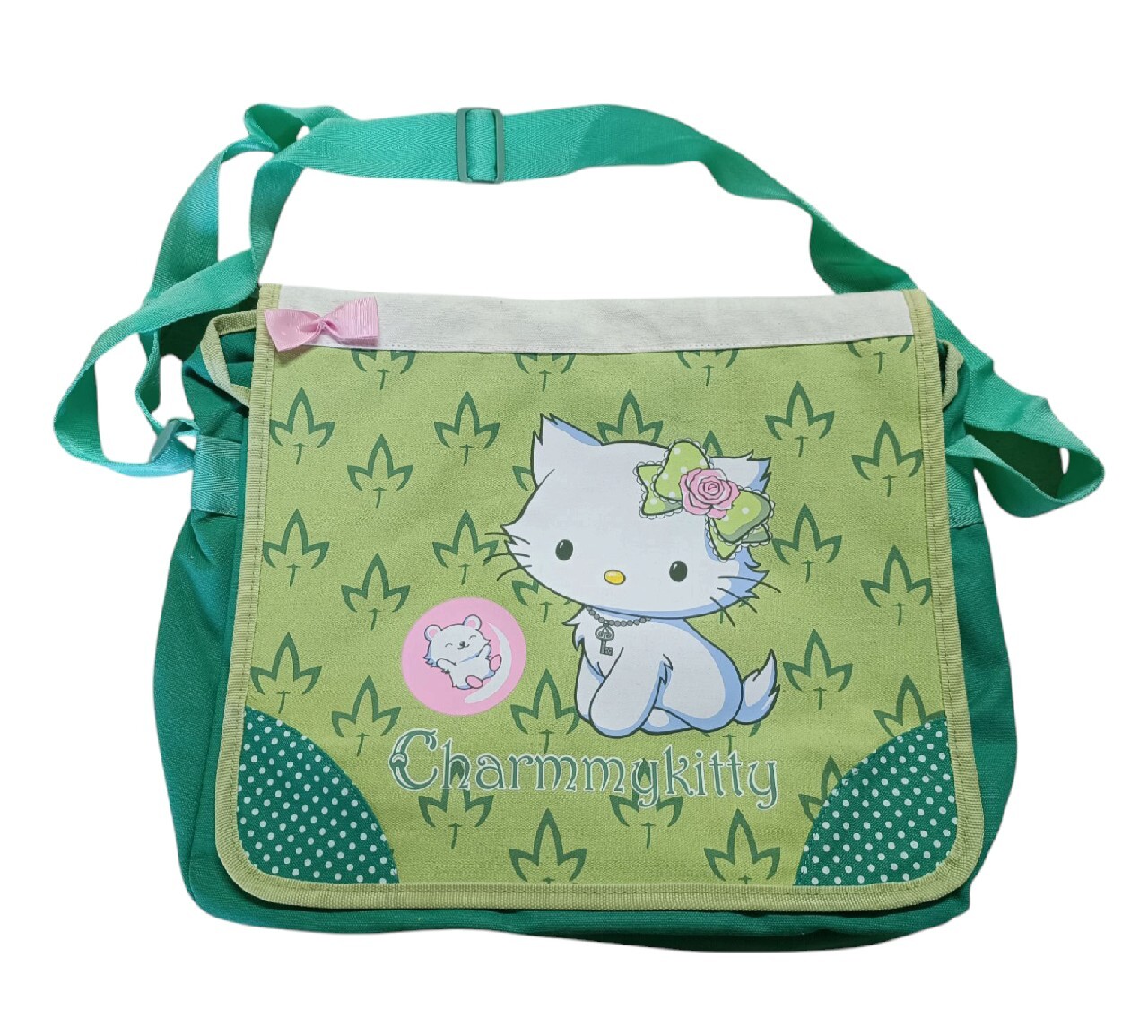 * Uroczy design: Torebka zdobiona jest wizerunkiem siedzącej Charmmy Kitty z kokardką we włosach oraz małej myszki. Delikatna kolorystyka w odcieniach zieleni i bieli z akcentami różu sprawia, że torebka jest niezwykle dziewczęca i przyciąga wzrok.