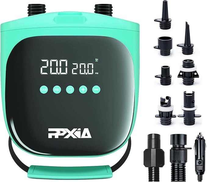 WYŚWIETLACZ WYSOKIEJ DEFINICJI: Ta elektryczna pompka powietrza SUP może pracować do 20 psi. Wyposażony w sterowanie przyciskiem, można ustawić wartości ciśnienia i monitorować ciśnienie w czasie rzeczywistym. Dwustopniowe nadmuchiwanie: pierwszy poziom zapewnia maksymalną prędkość przy 250 l/min, a następnie drugi poziom dla maks. ciśnienia przy 70 l/min, nadmuchiwanie i opróżnianie staje się łatwe.