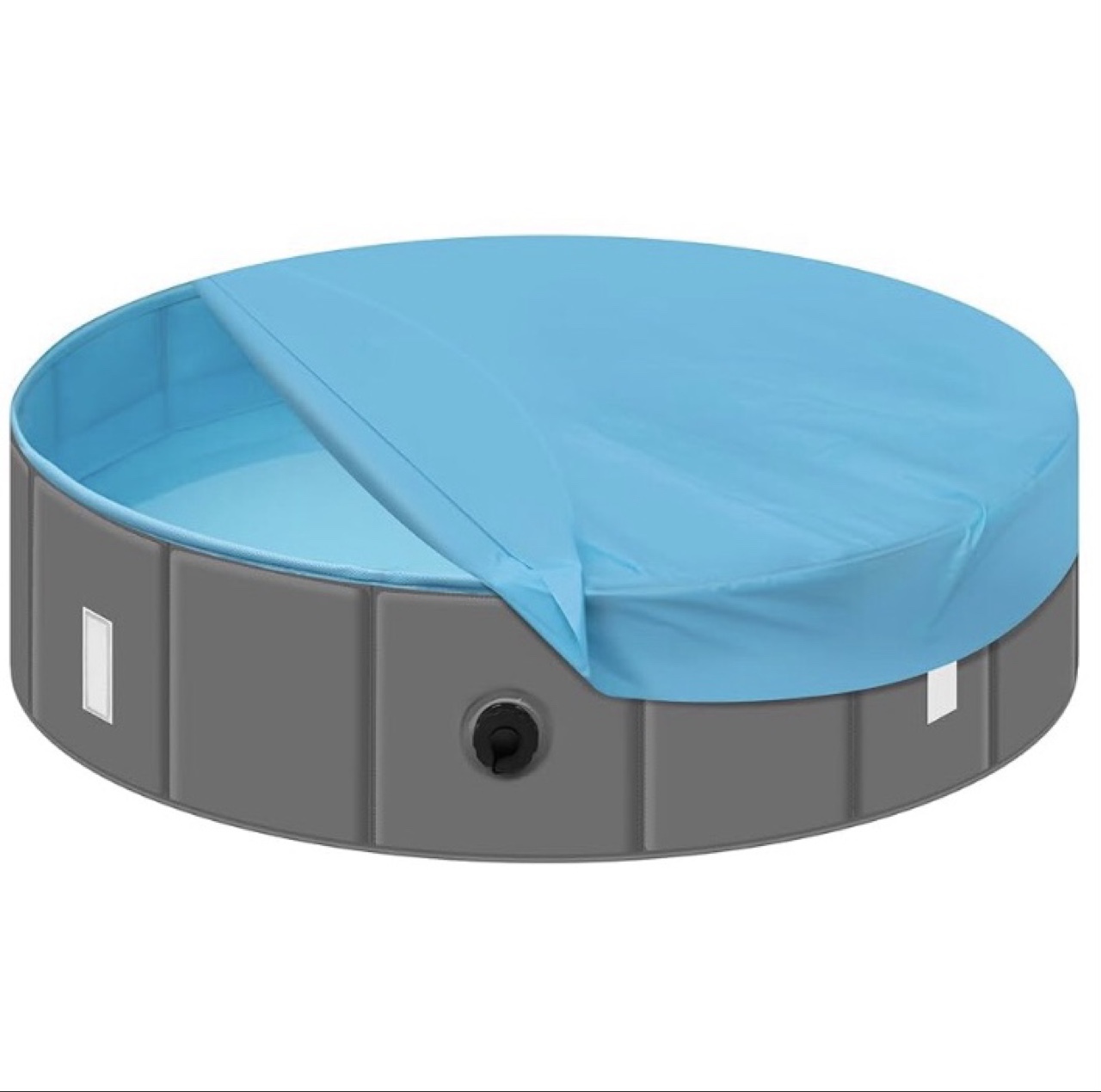 Basen dla psa z pokrywą: zapięcia na rzepy umożliwiają przymocowanie pokrowca do basenu, dzięki czemu nie zdmuchuje go wiatr i zapobiega wpadaniu liści i kurzu do wanny dla psa, utrzymując wodę czystą i higieniczną