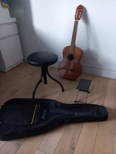 Sprzedam gitare 3/4 z podnóżkiem, taboretem, pokrowcem. Gitara niestety lekko uszkodzona jest zewnętrznie. Natomiast jest w 100% sprawna
