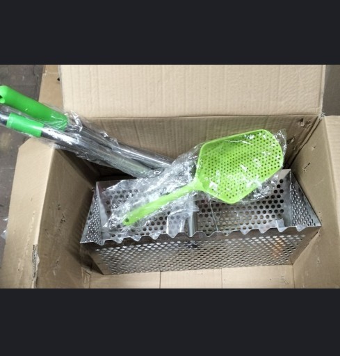 Nowy, zielone grabie do piasku w opakowaniu. Praktyczny i wytrzymały sprzęt do poszukiwań w piasku na plaży . Przydatny do przeczesywania powierzchni piasku.