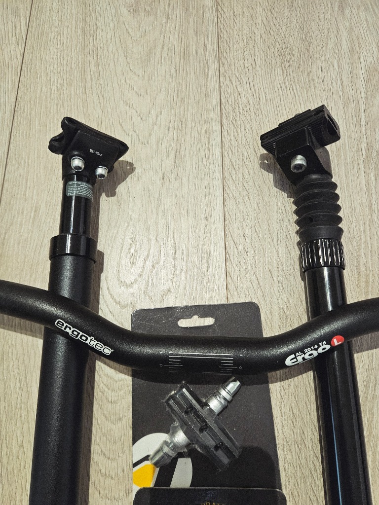 Akcesoria rowerowe kierownica, dwie sztyce siodełka, klocki hamulcowe. Można kupić w całości lub pojedyncze elementy, Czekam na propozycje cenowe.