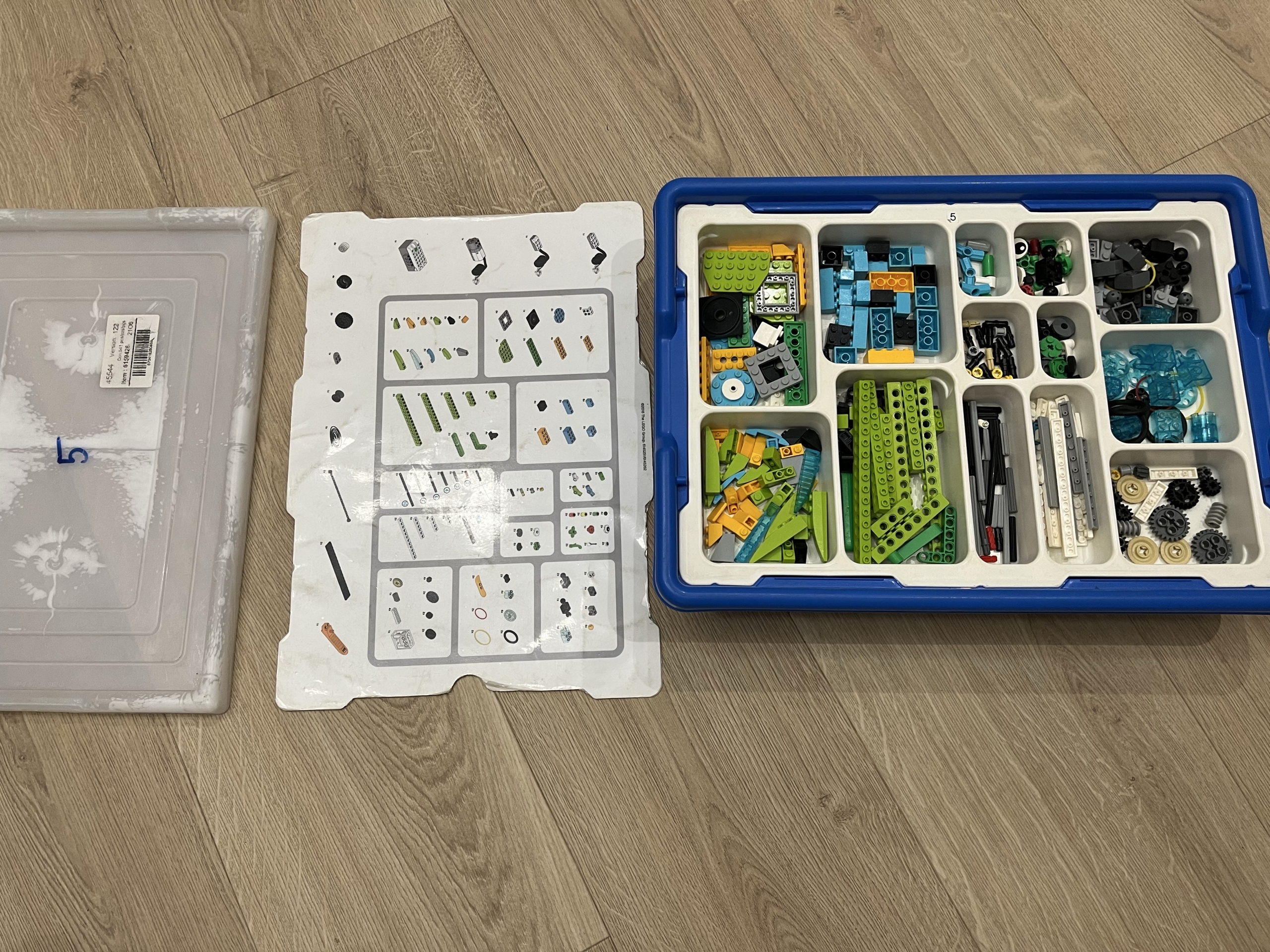 • Pojemnik z przegródkami i klockami LEGO (elementy mechaniczne, koła zębate, osie, kolorowe klocki)