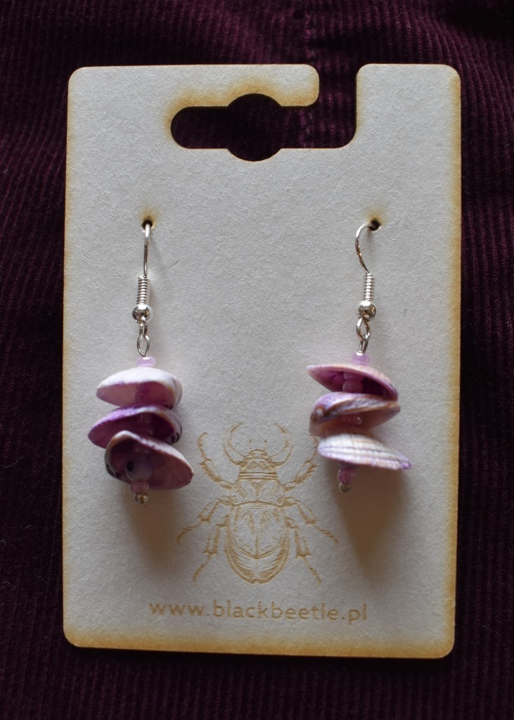 Kolczyki ze szklanych koralików i barwionych muszli, robione ręcznie, elementy metalowe ze stopu metali.