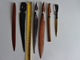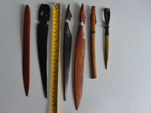Na sprzedaż widoczna kolekcja starych nożyków do otwierania listów. Cztery drewniane wykonane z jakiegoś egzotycznego drewna, jeden mosiężny i jeden w stylu katany. Zachowane wszystkie w bardzo ładnym stanie, cena za cały widoczny zestaw, orientacyjne wymiary widoczne na pierwszym zdjęciu.