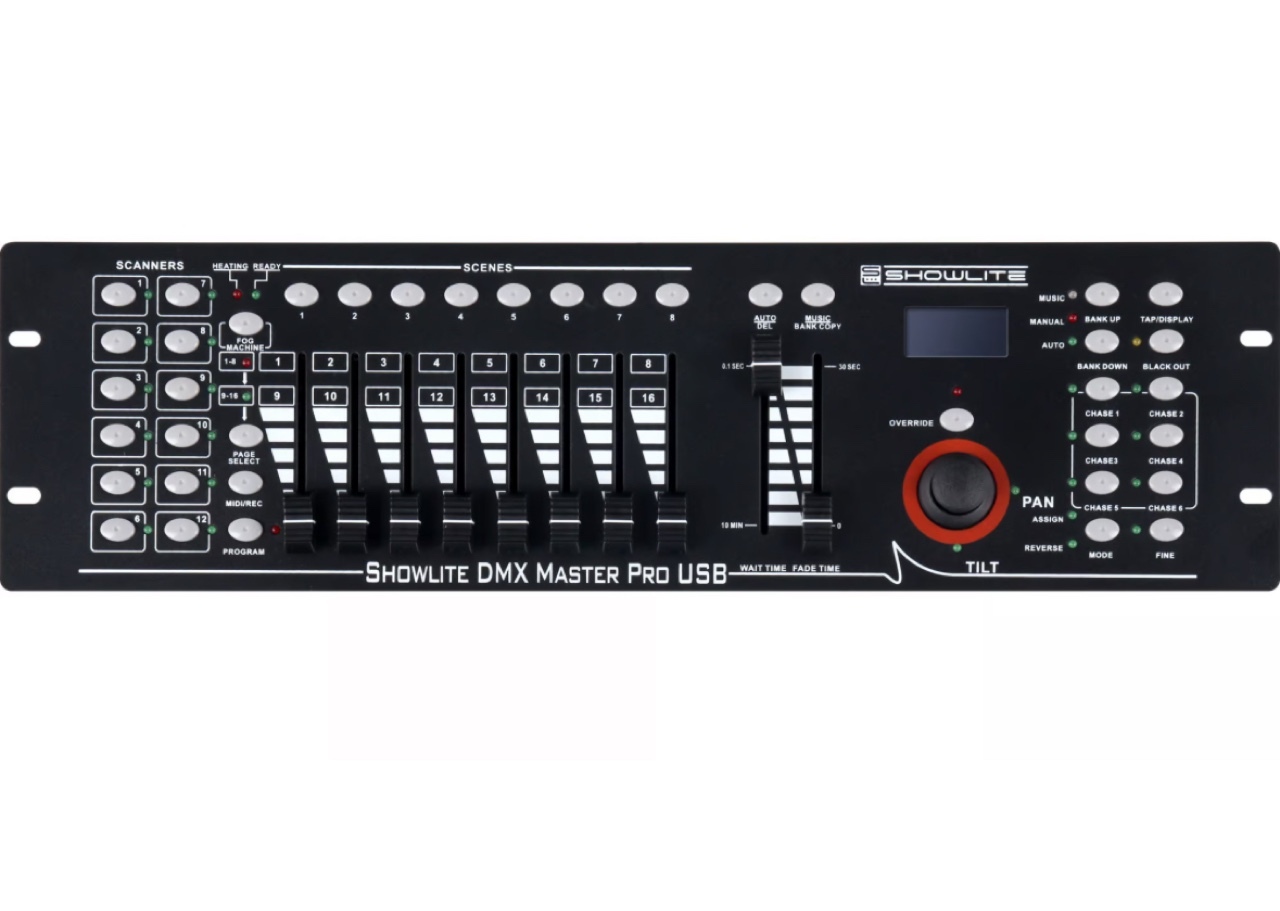 Showlite Master Pro USB to kontroler DMX z interfejsem USB do tworzenia kopii zapasowych danych. Kontroler umożliwia sterowanie maksymalnie 12 urządzeniami obsługującymi DMX – w tym urządzeniami LED – z maksymalnie 16 kanałami DMX każde.Ustawienia poszczególnych kanałów reguluje się za pomocą 8 suwaków (strona A: rozdz. 1-8, strona B: rozdz. 9-16). Dostępny jest również joystick do regulacji nachylenia (reflektor w górę/w dół) i panoramy (reflektor w lewo/w prawo). Wszystkie elementy sterujące urządzenia można zapisać jako sceny. Do tego celu dostępnych jest 30 banków pamięci, każdy z 8 pamięciami scen (maks. 240 lokalizacji).