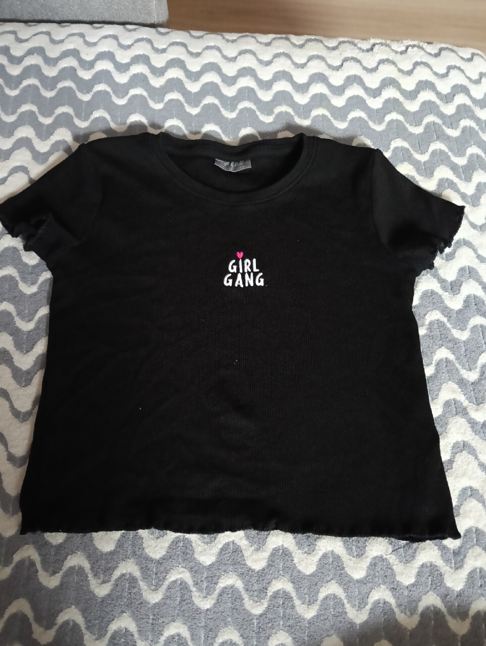 Czarna, prążkowana koszulka z delikatnym napisem w rozmiarze 146/152 choć będzie również pasować na rozmiar 140.