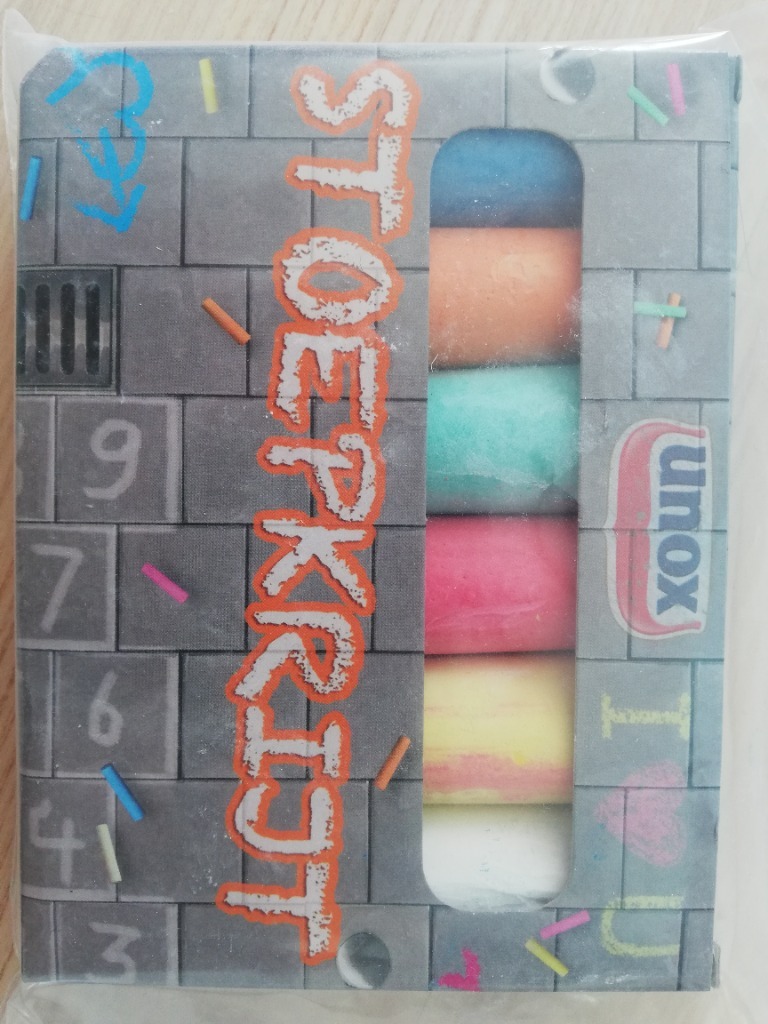 Kredy są kolorów: niebieskiego, pomarańczowego, zielonego, różowego, żółtego i białego.