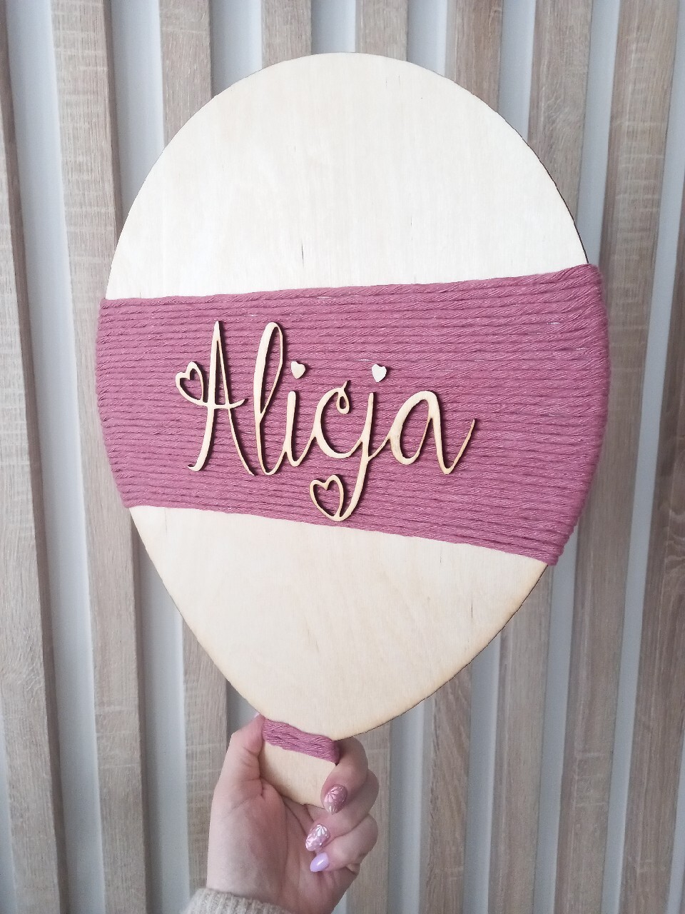 Dekor ścienny w kształcie balona ozdobiony wloczka. Imię oraz kolor wloczki personalizowane. Możliwość kupna z opcją lampki za 75zl