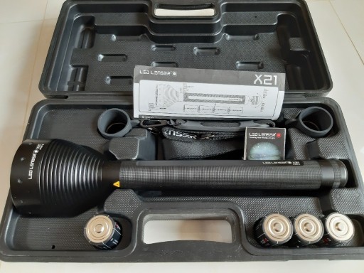 Latarka LED LENSER X21 Nigdy nie używana, kupiona w sklepie. Kompletny zestaw, wszystko sprawne. Strumień światła 1000 lumenów, zasięg 500m, maksymalny czas świecenia 100h