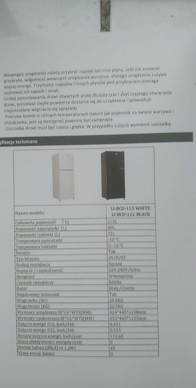 | Liczba półek w chłodziarce | 3 |