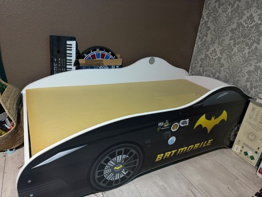 Łóżko w kształcie batmobila z motywem Batmana. Używane, ale w dobrym stanie. Może służyć jako wyjątkowe łóżko dla dziecka lub fana Batmana. Długość- 160cm. Szerokość- 80cm Odbiór osobisty!