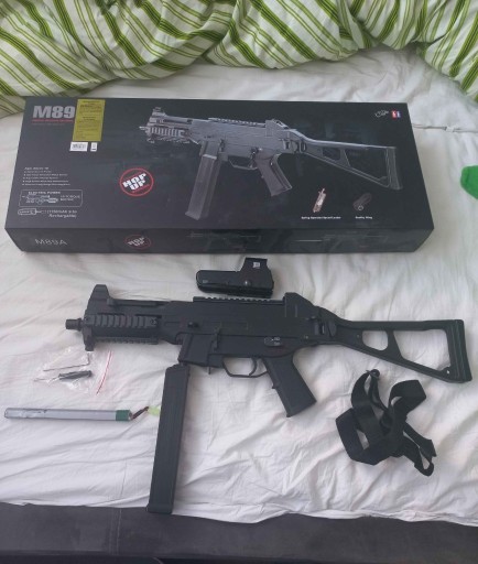 Replika M89A EE. Mechanizm repliki dopasowuję się do najnowszych trendów wykonania przez wiodących producentów z Chin. W gearboxie mamy komplet stalowych zębatek pozwalający na zamontowanie mocniejszej sprężyny (100 m/s) co daje dzięki zastosowaniu kierunkowej głowicy tłoka i doszczelnieniu całego mechanizmu siłę wystrzału około 350 FPS.