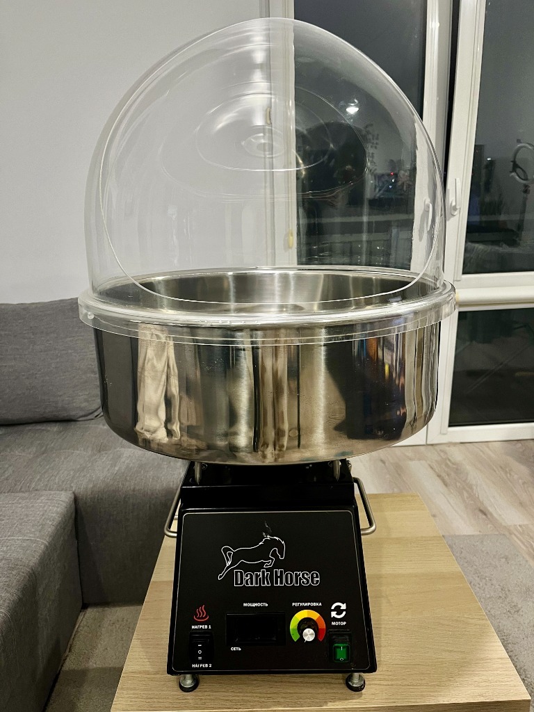 Profesjonalne urządzenie do przygotowywania waty cukrowej z osłoną ochronną DARK HORSE. Używane było tylko kilka razy w domu, więc jest w doskonałym stanie i wygląda jak nowe. Działa bez zarzutu, bez żadnych problemów technicznych. Idealne do robienia różnych figurek, kwiatów i innych rzeczy z waty cukrowej. Naprawdę jakość przerażająca!