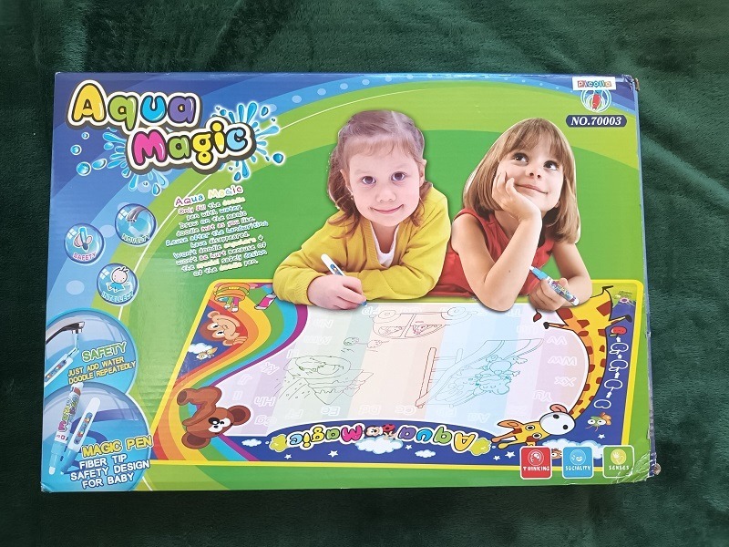 Mata wodna do rysowania AQUA MAGIC 75x50cm, używana, w dobrym stanie. KOMPLETNA (ma sprawne pisaki i pozostałe elementy, książeczka czysta). Lekko uszkodzone narożniki pudełka (widoczne na zdjęciu).