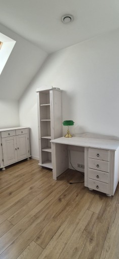 Meble sosnowe białe do pokoju dziecięcego: biurko, regał, komoda. Używane, ale w dobrym stanie. Meble wykonane z litego drewna.