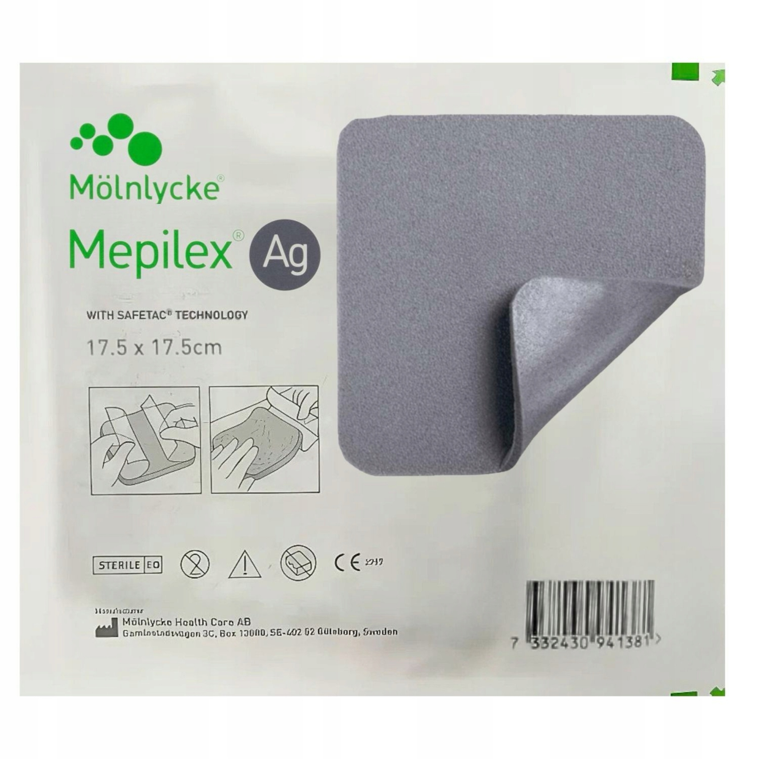 Pojedyncze opatrunki marki Molnlycke Mepilex Ag w rozmiarze 17,5x17,5