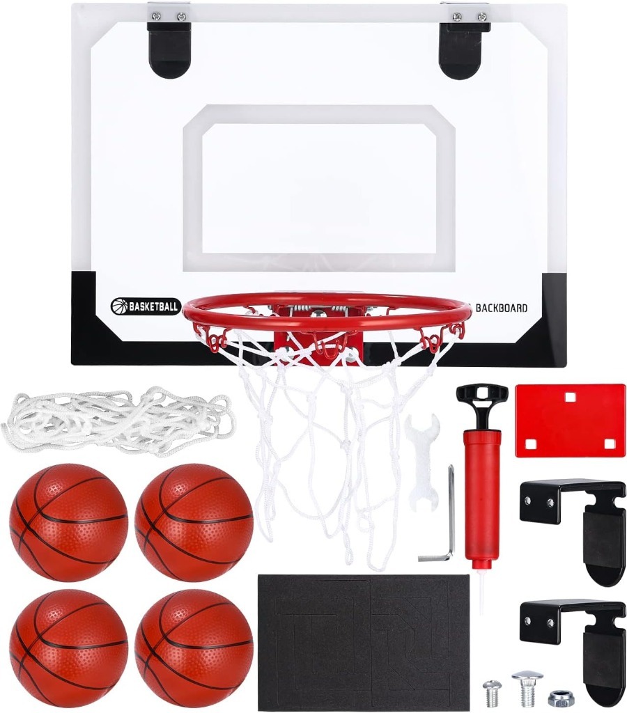 【Łatwy w instalacji】: kosz do koszykówki na hali Nasz zestaw kosza do koszykówki montowany na drzwiach zawiera wszystkie niezbędne narzędzia, takie jak 4 gumowe piłki do koszykówki, obręcz ze stalową obręczą, siatka na piłki, tablica, pompka powietrza i kompletny sprzęt montażowy. Można go także zamontować na ścianie. 40 x 30 cm, szerokość drzwi, które może pomieścić hak, wynosi 2,17 cala i pasuje do wszystkich standardowych drzwi w domu, akademiku i biurze.