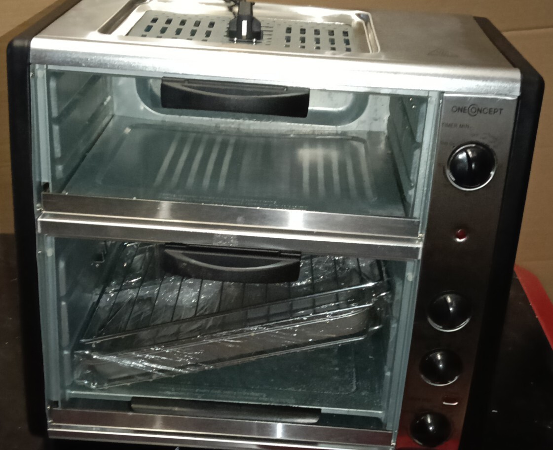 Obie komory do pieczenia wyposażone są w wyłącznik czasowy (timer) i szufladę na okruszki. Temperaturę niższej półki można poza tym regulować za pomocą termostatu. Niezależnie od tego, czy będzie używany na co dzień, czy też w altanie ogrodowej lub na imprezach o kulinarnych ambicjach: Piekarnik All-You-Can-Eat firmy oneConcept świetnie sprawdza się wszędzie!