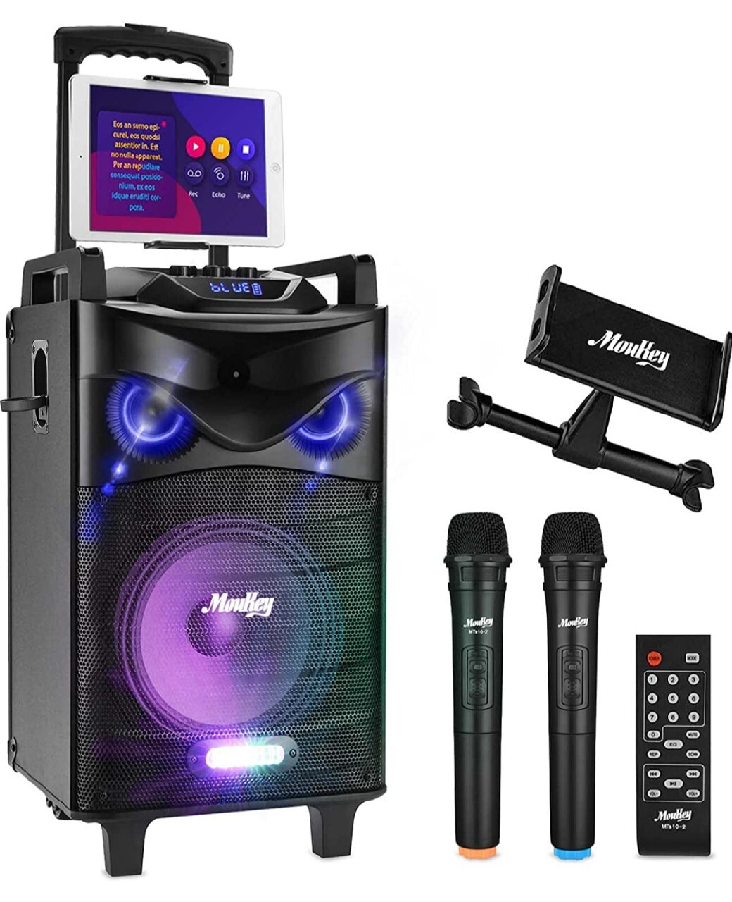 Moukey głośnik do karaoke Bluetooth moc 160 W PA z DJ Lights, mikrofon Dual VHF, uchwyt do tabletu, uchwyt MP3/USB/TF/FM.