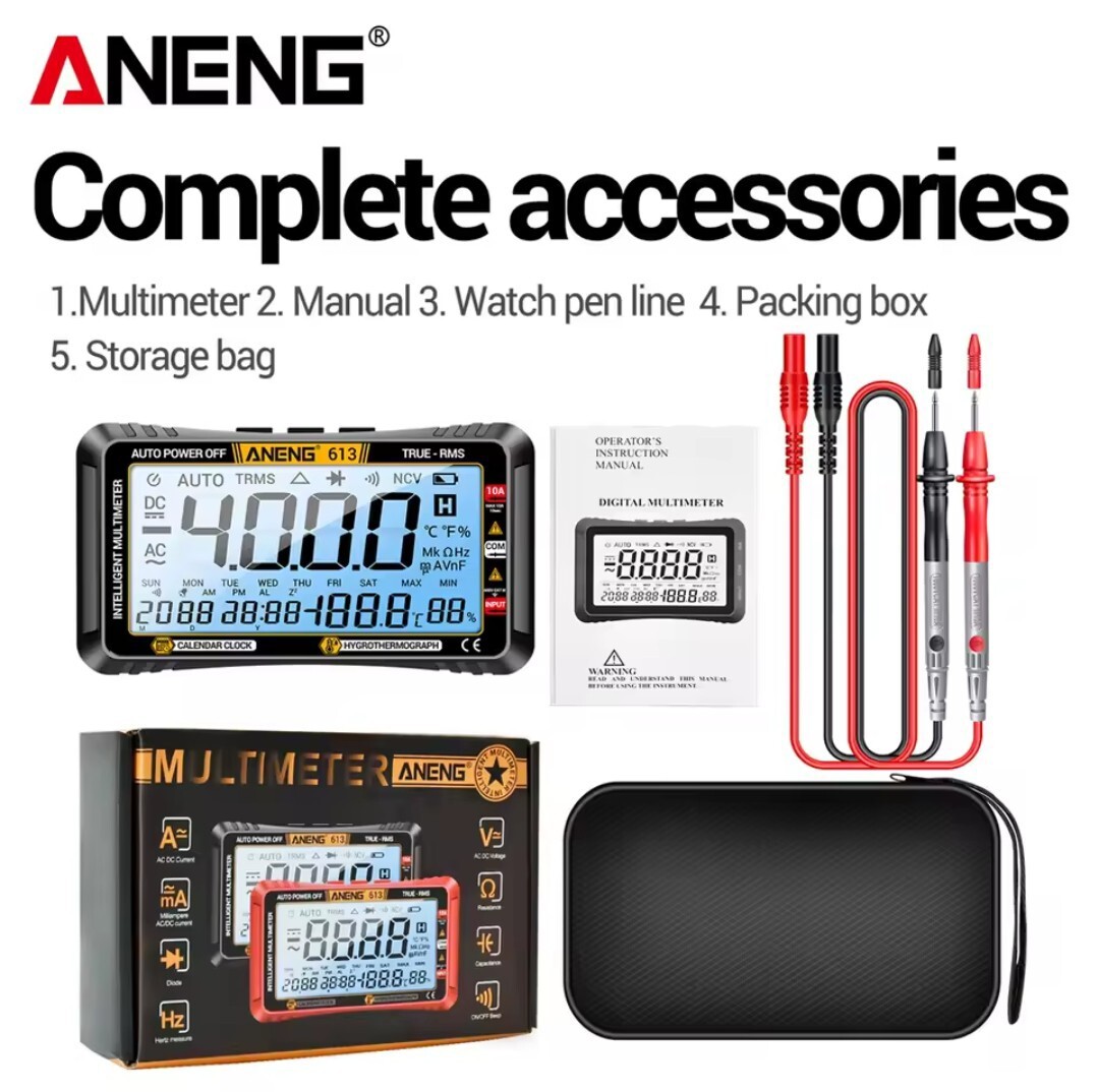 Multimetr Aneng 613 to kompaktowy, cyfrowy przyrząd pomiarowy, służący do pomiaru podstawowych wielkości elektrycznych, takich jak napięcie stałe (DC) i przemienne (AC), prąd stały (DC) oraz rezystancja (opór). Wyposażony jest także w funkcje dodatkowe, takie jak test diod, ciągłości obwodu (buzzer) i pomiar pojemności. Urządzenie to charakteryzuje się automatyczną zmianą zakresów pomiarowych (autoranging), co upraszcza użytkowanie, ponieważ nie ma potrzeby ręcznego ustawiania odpowiedniego zakresu przed pomiarem. Jest to popularny wybór dla hobbystów, studentów i elektryków-amatorów ze względu na swoją prostotę obsługi i przystępną cenę.