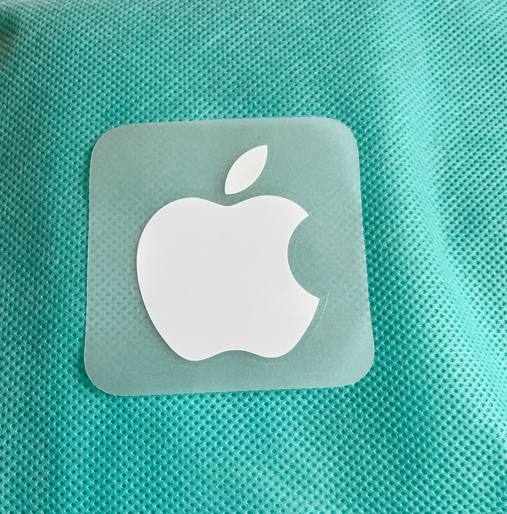 Biała płaska naklejka logo Apple o wymiarach 6 x 6 cm. Nowy bez metki.