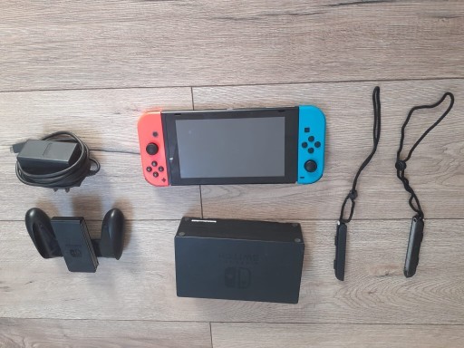 W zestawie konsola z joy conami, oryginalny grip do joy conów, strapy, ładowarka (zamiennik), kabel HDMI, dock i pudełko. to do nintendo