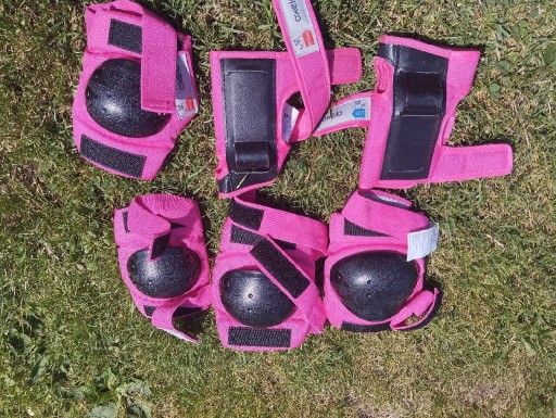 Ochraniacze w kolorze różowym 3 stopniowe (kolana, łokcie, ręce) zakupione w dekatlonie użyte 2 razy Rozmiar xs