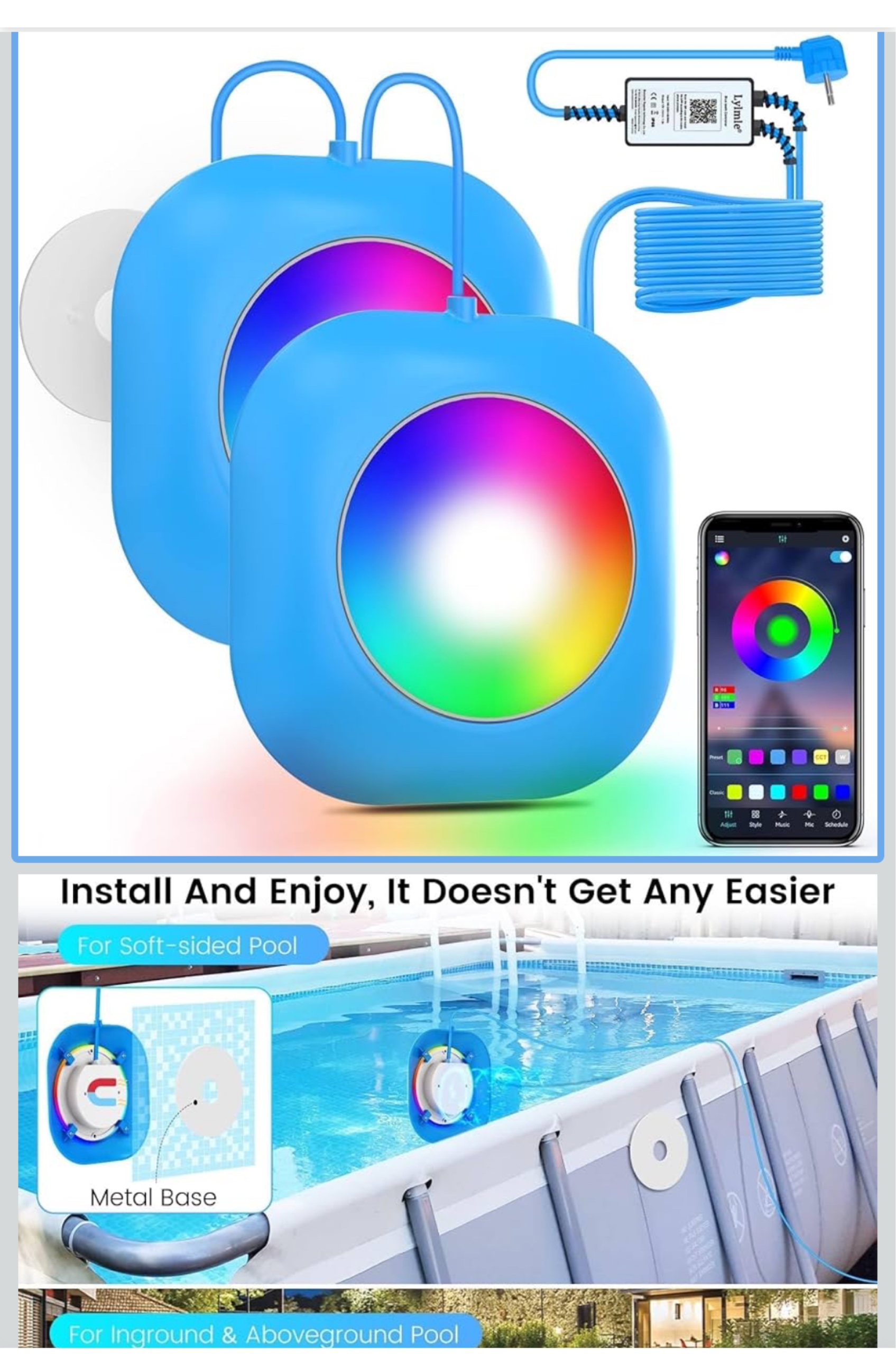 Łatwa instalacja do wszystkich rodzajów basenów w ciągu kilku minut – to magnetyczne oświetlenie basenu może zostać zamocowane na stałe na wszystkich basenach ze stalowymi ściankami/powierzchniach. Ponadto oferujemy metalową podstawę do wszystkich niestalowych ścian basenowych, aby dobrze zamocować magnetyczną lampę basenową. Bez wiercenia, montaż w kilka minut i łatwy samodzielny montaż są równie bezproblemowe. Zaprojektowana z myślą o użyciu z basenami rozkładanymi, basenami do zabudowy, spa i wszędzie tam, gdzie sobie tego życzysz.