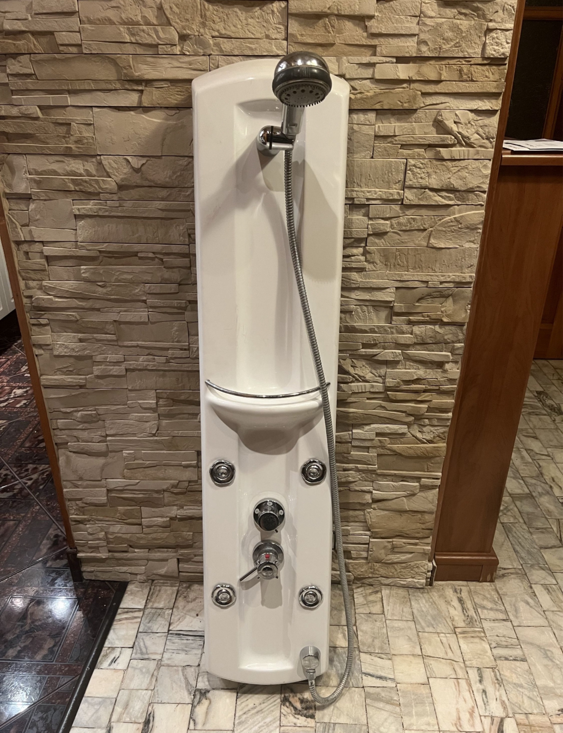 Panel prysznicowy wysokiej klasy z hydromasażem oraz deszczownią.