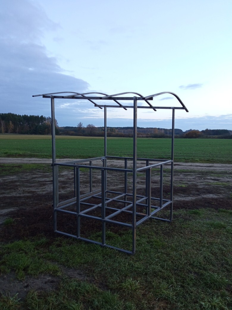 Paśnik na baloty siana i sianokiszonki o wymiarach 120cm na 120cm. Paśnik jest 12 stanowiskowy i ma wysokość 120 cm. Stanowiska mają 75 cm wysokości i 46 cm szerokości. Konstrukcja stoi na 5 nogach jest opcja wykonania dwóch bądź trzech płóz. Przedłużki do dachu są przykręcane do konstrukcji paśnika na 8 śrub i do konstrukcji dachowej, której wymiar to 2 m na 2 m. Daszek jest na wysokości 2.5 m. Istnieje możliwość wykonania indywidualnej wycenę w wypadku zmiany parametrów technicznych. Zapraszam do kontaktu telefonicznego 796 661 138