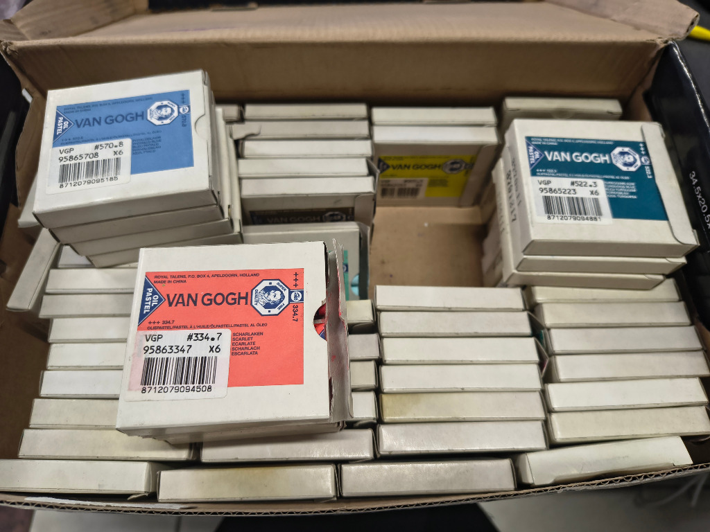 Kredki pastelowe olejne firmy Van Gogh. Na zdjęciu tylko pogląd ile ich jest, poniżej zestawienie kolorów i ilości.