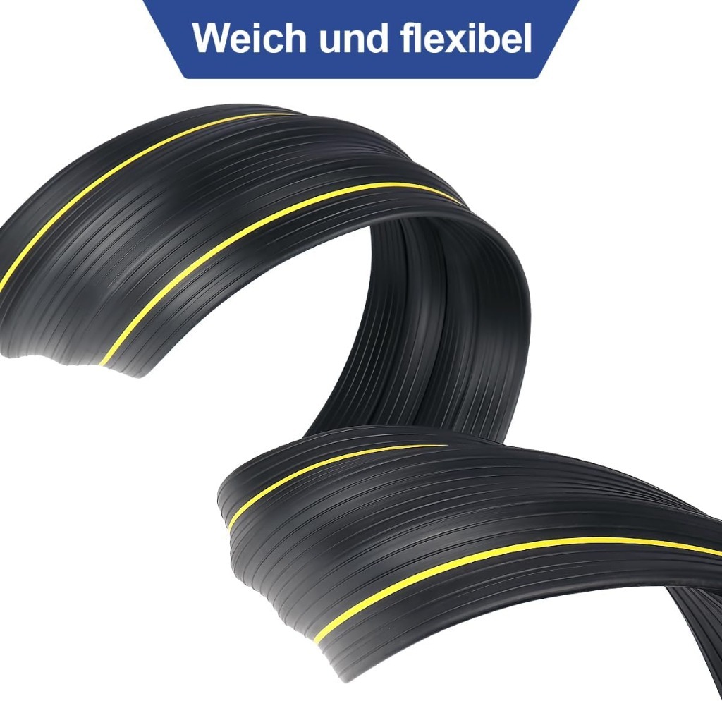 Ta wszechstronna czarna osłona kabli podłogowych skutecznie ukrywa i chroni kable, przewody i przewody, pomagając utrzymać czystość i bezpieczeństwo na podłodze. Płaska powierzchnia zewnętrzna zapobiega potknięciom i umożliwia płynne toczenie kół i wózków. Antypoślizgowa tekstura na spodzie zapobiega ślizganiu się na gładkich podłogach. Taśma klejąca nie jest dołączona do zestawu. Bezwonny, elastyczny materiał PVC można łatwo rozwinąć i przeciąć: Podłogowa osłona kabla wykonana jest z mocnego, elastycznego czarnego PVC. W przeciwieństwie do gumowych ochraniaczy podłóg, ta wersja z PVC po wyjęciu z pudełka nie wydziela nieprzyjemnego zapachu, jest łatwa do rozwinięcia i nie wymaga dodatkowej obróbki (ogrzewania, gotowania), aby położyć ją na płasko. PCV można łatwo przyciąć na dowolną długość nożem lub mocnymi nożyczkami. PVC zapewnia dodatkową izolację kabli głośnikowych i kabli kina domowego.